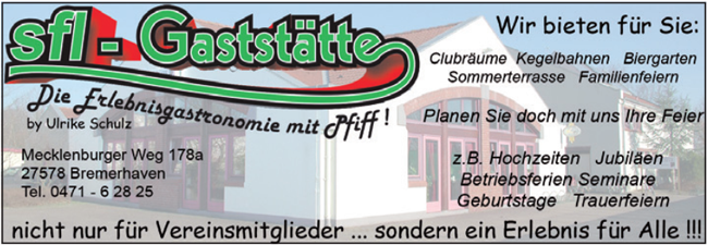 VerstecktDer Vorstand des SFL Bremerhaven ist sehr froh darüber, dass folgend aufgeführte Unternehmen mit ihren Anzeigen den SFL Bremerhaven unterstützen. Erst mit dieser Unterstützung ist es uns möglich, unsere Mitglieder über die aktivitäten im Verein zu informieren.