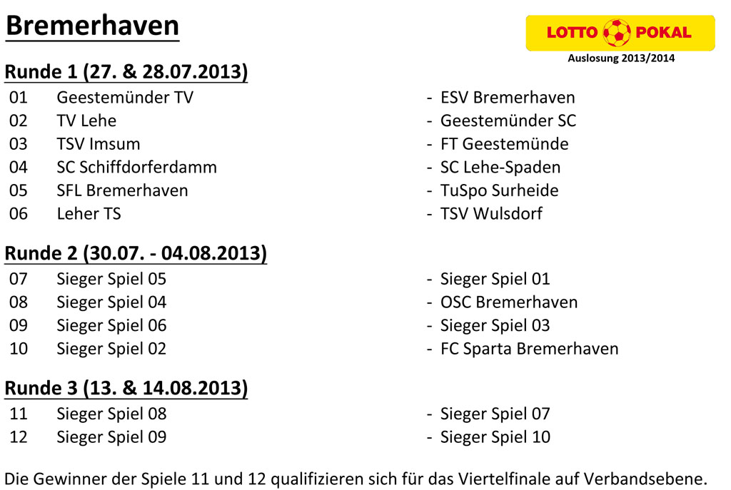 In Bremerhaven treten insgesamt 14 Mannschaften an, um den Pott zu holen. Der OSC Bremerhaven und der FC Sparta dürfen sich dabei über ein Freilos freuen und greifen erst in Runde zwei ins Geschehen ein. Für das meiste Interesse seitens der Fußballfans an der Unterweser dürfte dabei die Partie zwischen der Leher TS und dem TSV Wulsdorf sorgen.