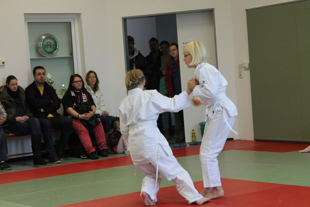 In der Klasse „Weißgurt“, Verteidigung gegen Hand/Armfassen, Reverse/Kragengriffe und Haarzug überzeugten Felix Teschner und Mattis Teschner ( 1. Platz), Adam Knol und Hendrik Schumacher (2. Platz), Ada Klara Meyer und Annalena Schalke (3. Platz).