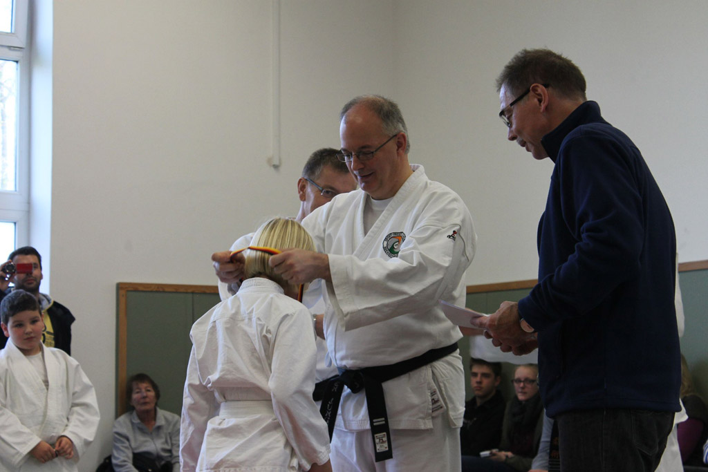 In der Klasse „Geldgurt“, Verteidigung gegen Fuß- und Stockangriff sowie Kopfumklammerung überzeugten Julia Krohn (1.Platz) und Tim Stevens und Markus Wilhelm (2. Platz).
