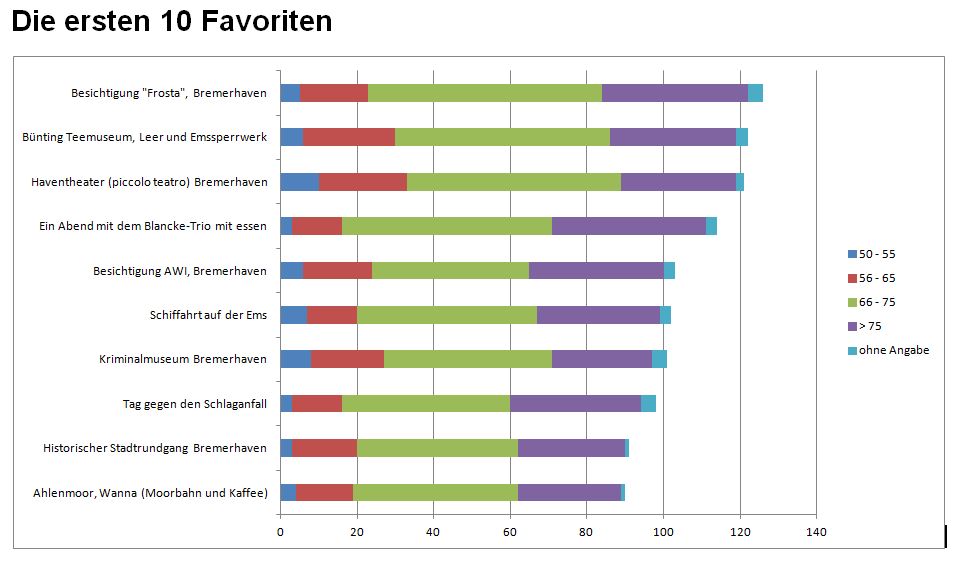 Von den Befragten gab es 230 Rückläufer, das ist eine Beteiligung von über 35% der 50+Mitglieder. Die Fragebögen wurden sorgfältig ausgewertet und am Ende standen die „Favoriten“ fest. (s. Diagramm)