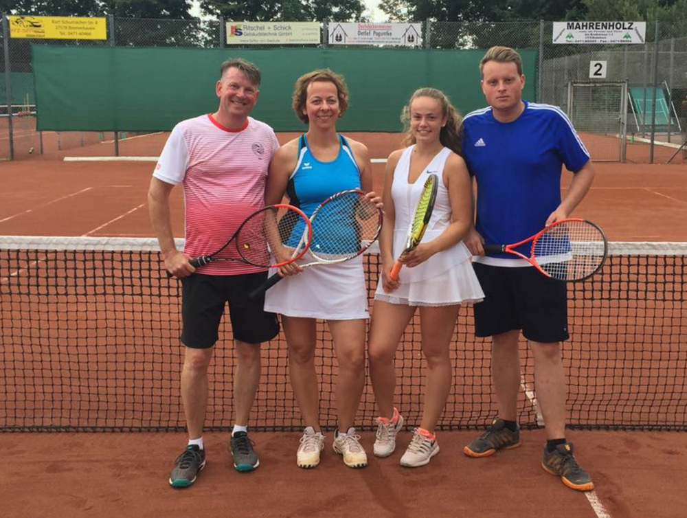 Meister und Vize: Michele Smykalla und Hendrik Serode konnten mit 7:6 und 6:4 in einem spannenden und fair geführten Finale gegen Iris und Jörn Straka gewinnen und erneut die Meisterschaft sichern. Foto von links: Jörn und Iris Straka und Michelle und Hendrik Serode |