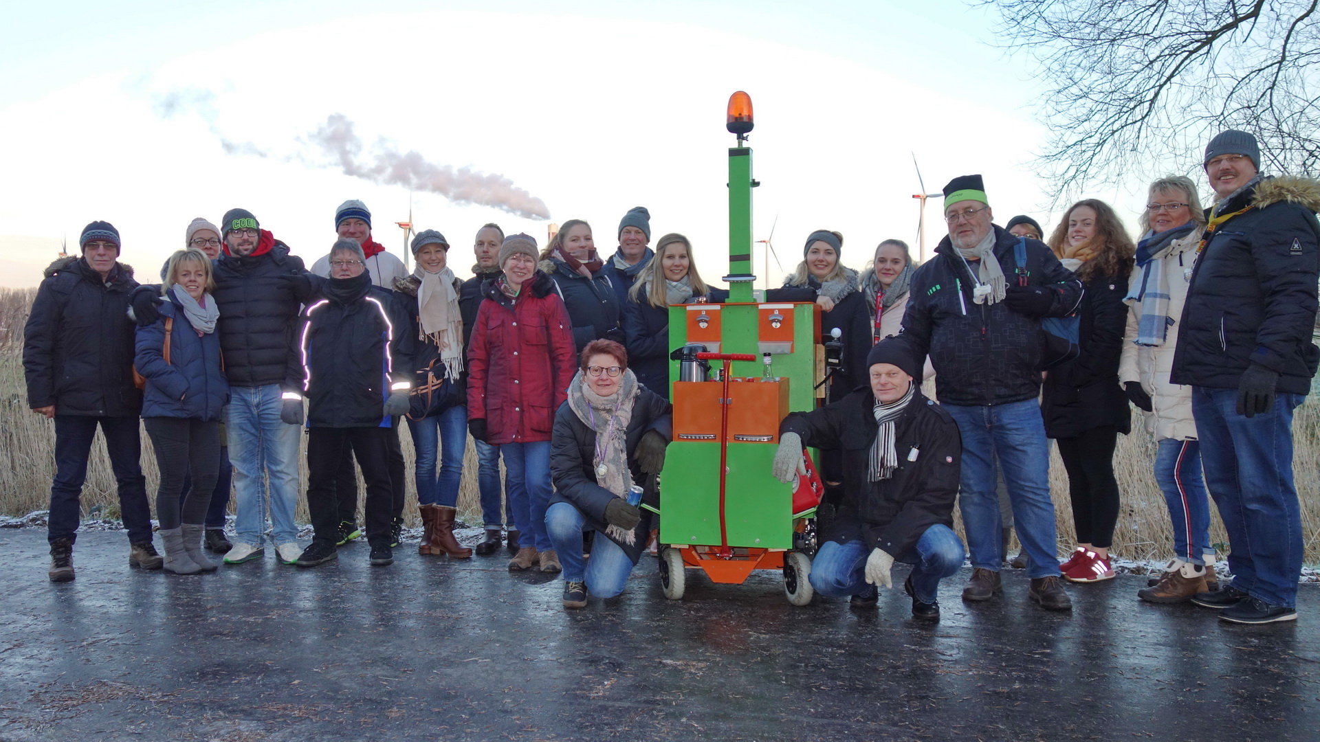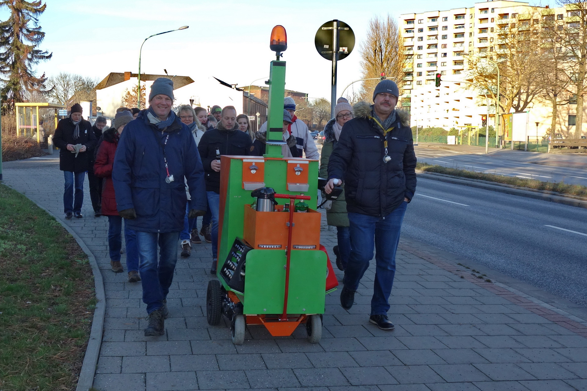 Michael Brünjes hatte das Grünkohlmobil wieder einmal modifiziert, so dass es sich locker mit den Fingern am Joystick (die andere Hand in der Hosentasche) steuern ließ. Den Vortrieb leistete nun das Fahrwerk eines elektrischen Rollstuhls. Es ging mit den obligatorischen Zwischenstopps zum Bürgerpark. |