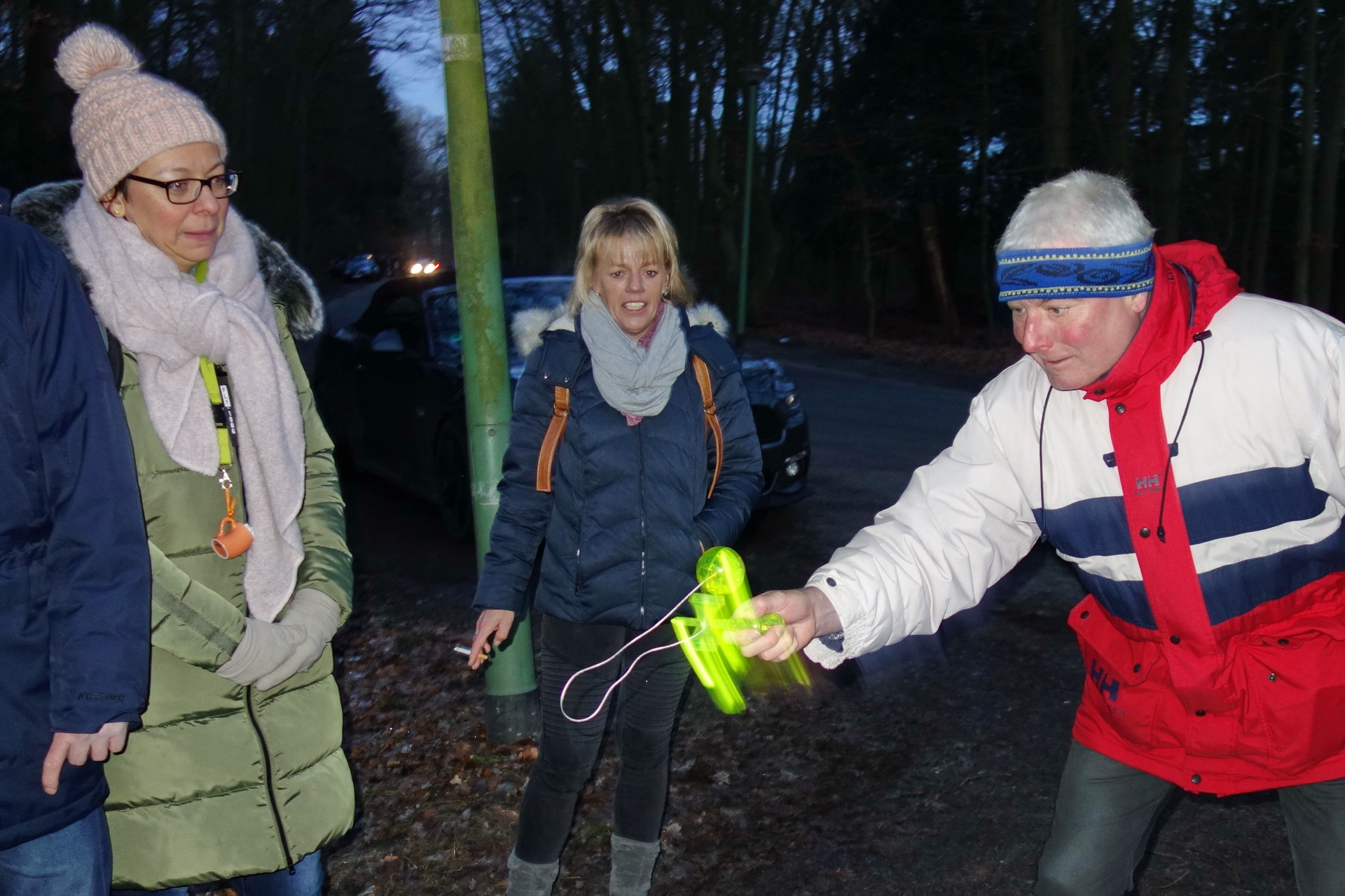 Wie es sich für eine Gruppe Sportler gehört wurden wir noch in unserer Geschicklichkeit geprüft. Da Hartmut einen bekannt harten Aufschlag serviert, wurde sein Ball vorsichtshalber mit einem Band gesichert. Den hätten wir ja sonst in der Dunkelheit nicht wiedergefunden. |